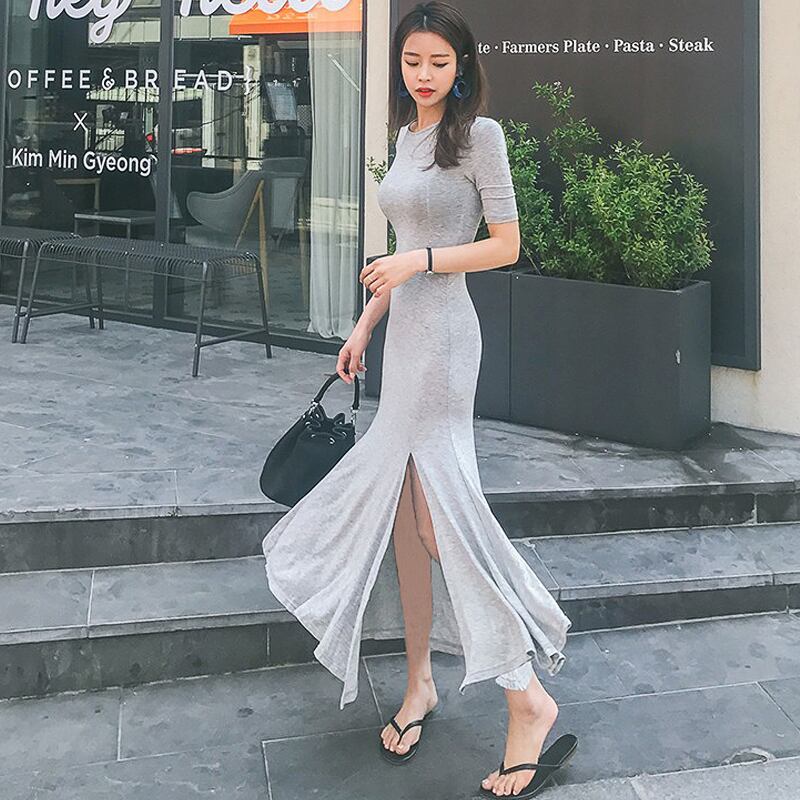 マキシワンピース 半袖 マーメイド フィッシュテール タイト スリット 無地 Aライン クルーネック カジュアル リゾート 夏 fsk0781