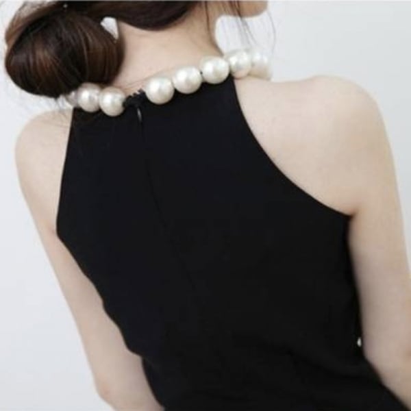 首元の大粒パール風飾りがとても華やさを放つシンプルなブラックのオールインワンです。腰回りはくびれたデザインでスタイルアップ期待大。シンプルかつ上品なデザインなので、幅広いシーンでお使いいただけます。