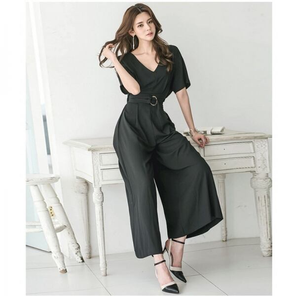 袖あり パーティードレス パンツ 結婚式 二次会 パンツドレス お呼ばれ 20代 30代 40代 オールインワン Vネック ベルト ワイドパンツ 黒