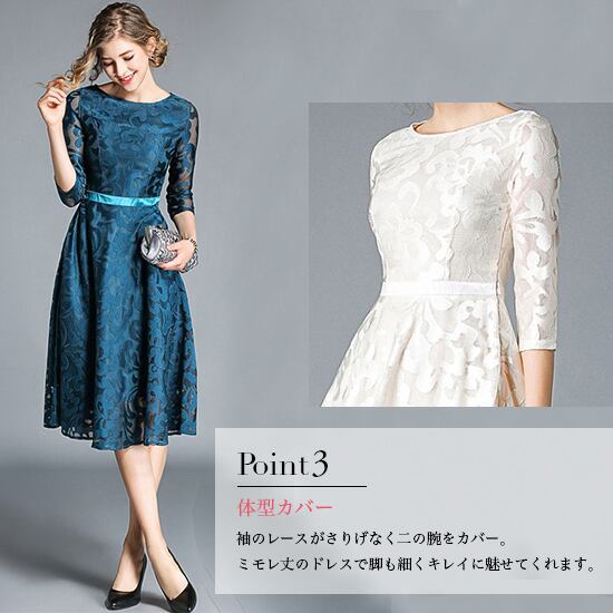 パーティードレス 結婚式 二次会 ワンピース 結婚式ドレス お呼ばれワンピース 20代 30代 40代 七分袖 ひざ下丈 上品 レース ウエストマーク fk1062