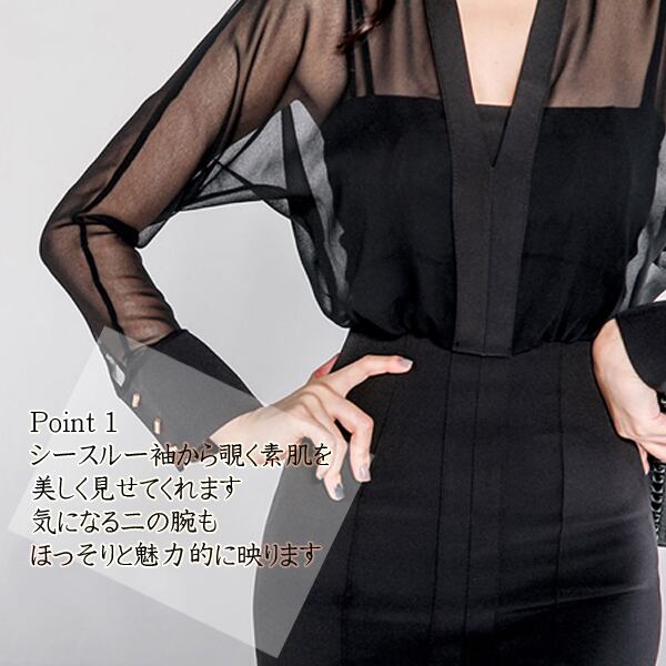 パーティードレス 結婚式 二次会 ワンピース 結婚式ドレス お呼ばれワンピース 20代 30代 40代 長袖 タイト ひざ丈 黒 シースルー セクシー fk1067
