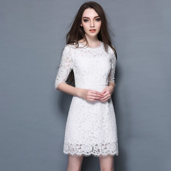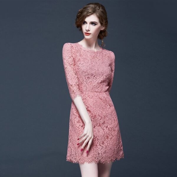 ワンピース パーティドレス レース ショート丈 ラウンドネック 七分袖 花刺繍 透け感 シースルー フェミニン エレガント 二次会 お呼ばれ ミニ