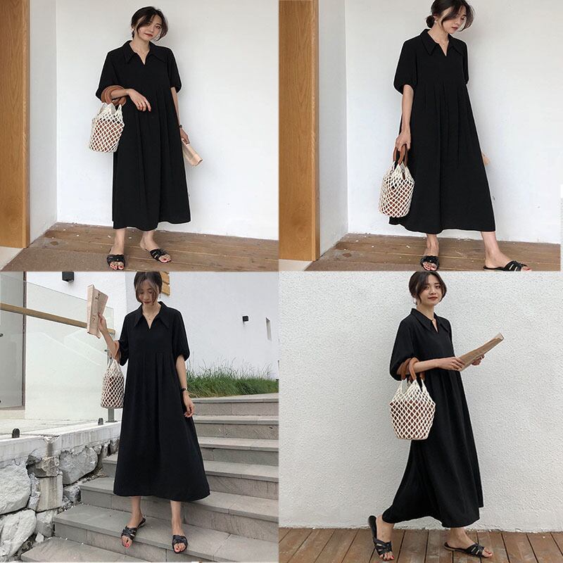 シャツワンピース マキシワンピース 半袖 Vネック 無地 ブラック 大きいサイズ ゆったり 体型カバー リラックス 夏 カジュアル