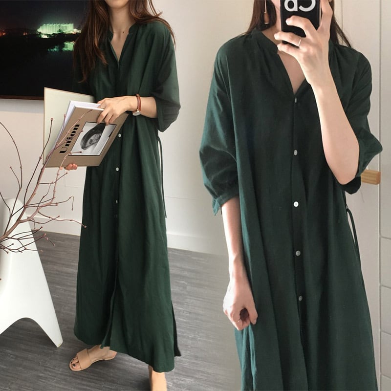 シャツワンピース マキシワンピース テラコッタ 半袖 Vネック レトロ ゆったり 無地 シンプル カジュアル きれいめ 夏 20代 30代 fsk0852