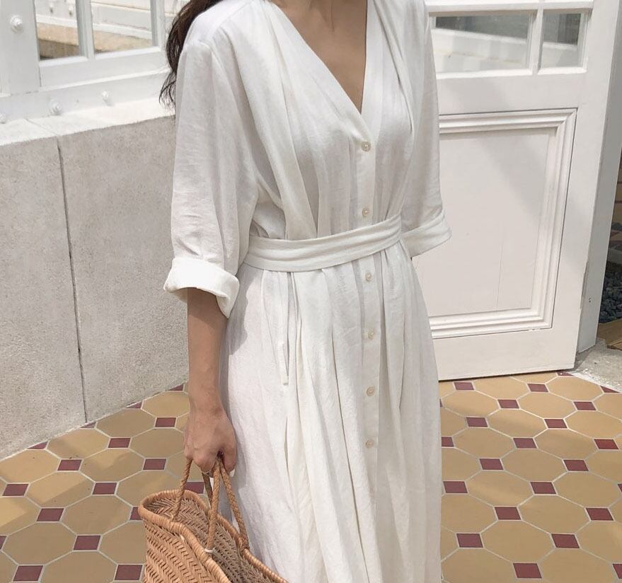 シャツワンピース マキシワンピース 五分袖 Vネック 無地 コットン ナチュラル レトロ リラックス ウエストマーク 夏 fsk0853