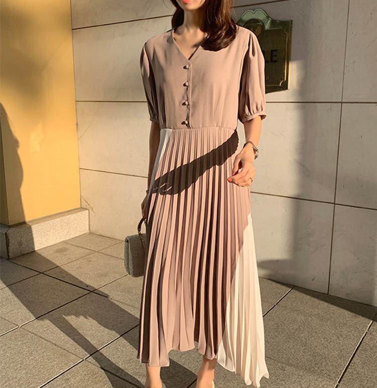 マキシワンピース 半袖 Vネック プリーツスカート 無地 ウエストマーク 体型カバー シンプル エレガント きれいめ 夏 20代 30代 fsk0854