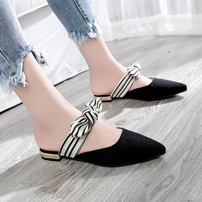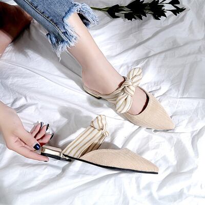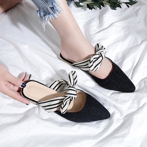 フラットシューズ サンダル ミュール ぺたんこ靴 リボン ストライプ ポインテッドトゥ マリン ブラック ベージュ 夏 カジュアル