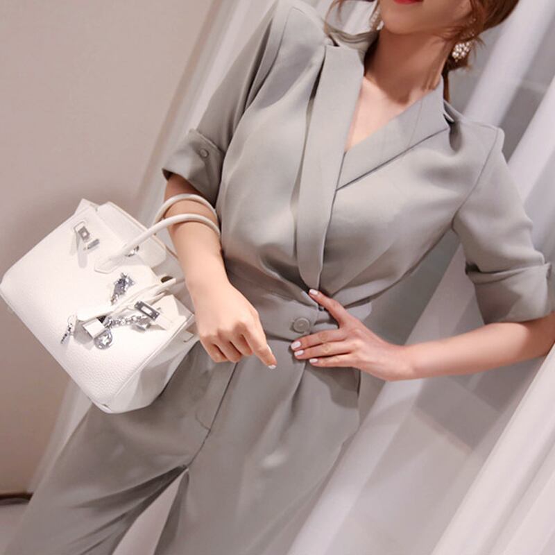 オールインワン 五分袖 Vネック グレー ウエストマーク ワイドパンツ 無地 シンプル きれいめ スタイリッシュ 夏 通勤 女子会