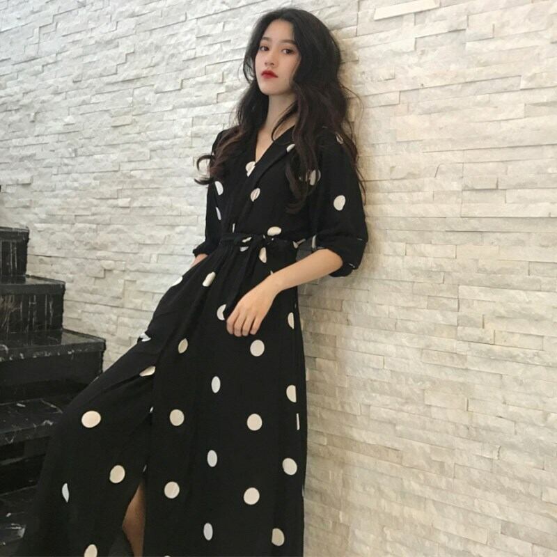 マキシワンピース 五分袖 モノトーン ドット 水玉 Vネック ウエストマーク リボン スリット 大人可愛い きれいめ 夏 20代 30代