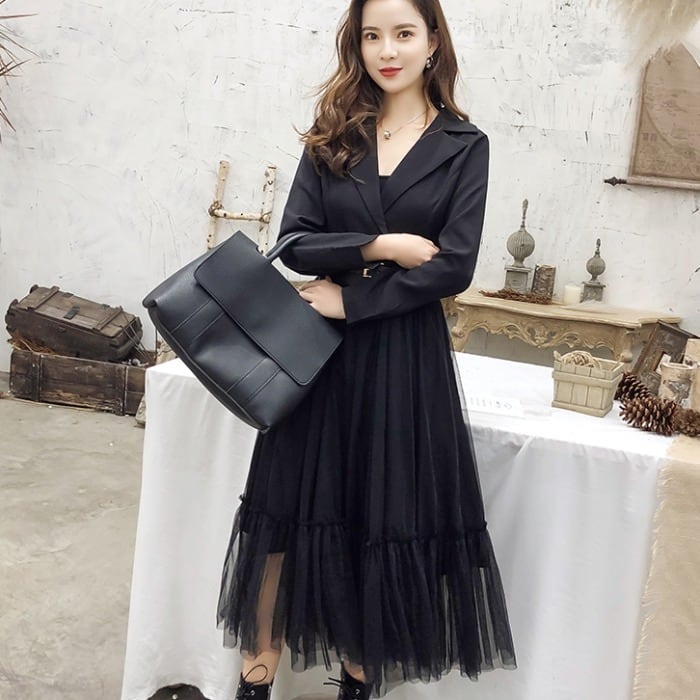 ふんわりと広がるチュールの重ね使いが軽やかさを添える、シンプルなミモレ丈ワンピース。首元はVネックで、デコルテラインを美しく見せてくれます。カラーは無地なので、華やかな小物やバッグをアクセントに取り入れても◎。オンオフ幅広く活躍しそうです。