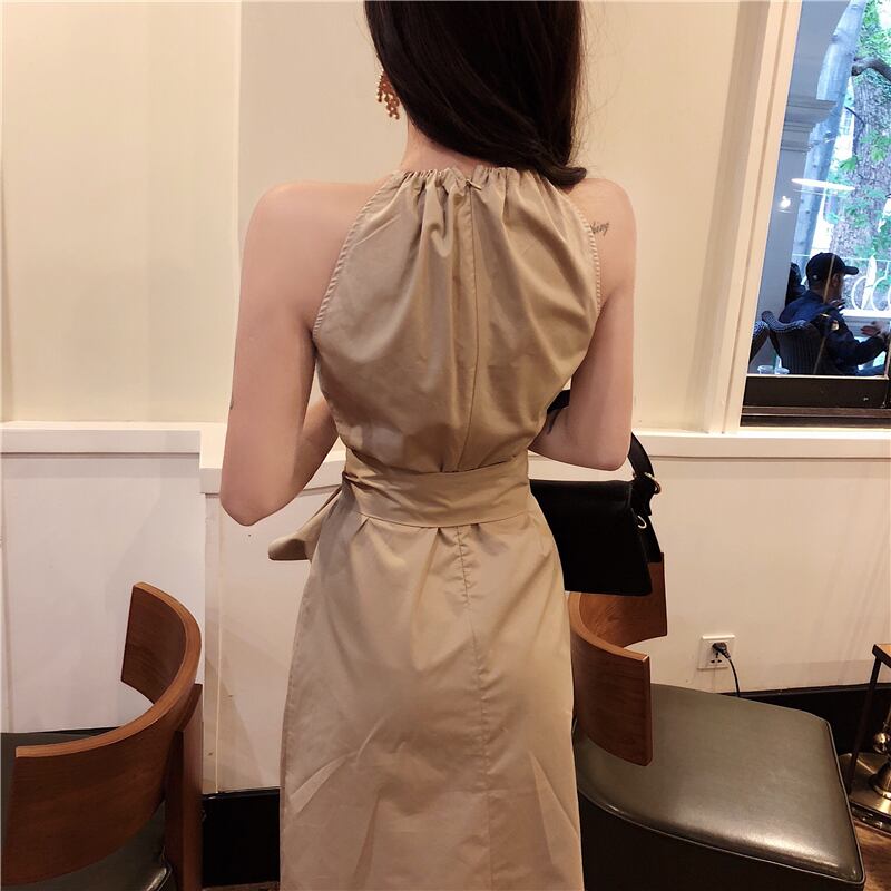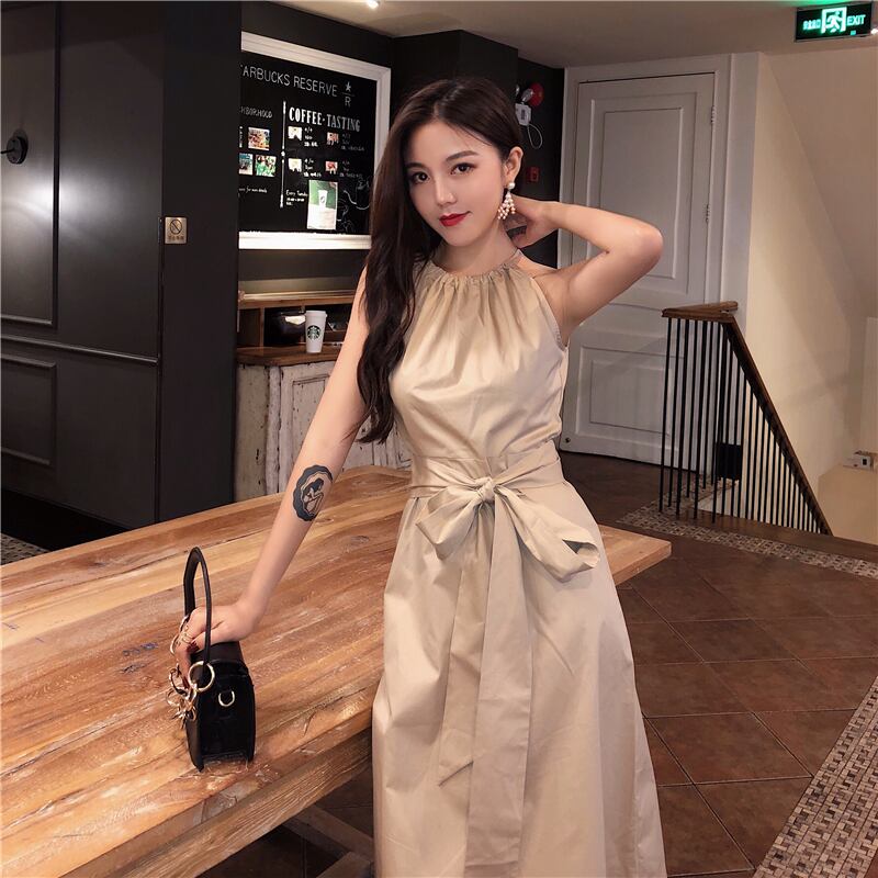 ひざ丈ワンピース ホルターネック ウエストマーク リボン Aライン 無地 エレガント きれいめ リゾート 夏 二次会 パーティー fsk1059