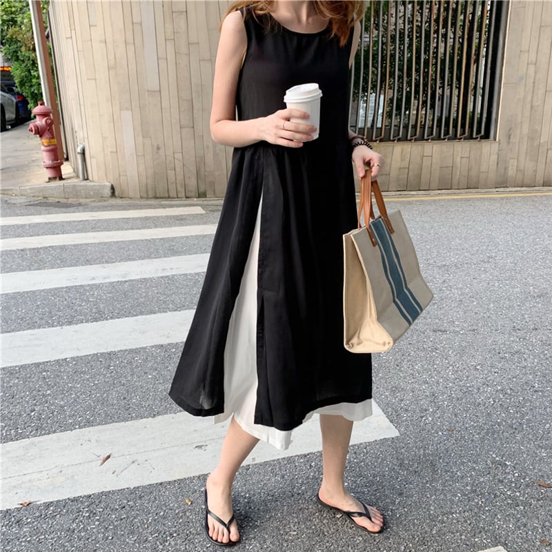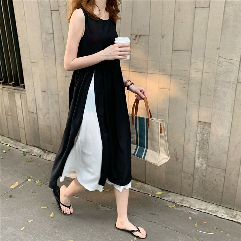 ノースリーブワンピース マキシワンピース ロング ベスト Aライン 無地 ブラック カジュアル シンプル スリット 夏 リゾート fsk1067