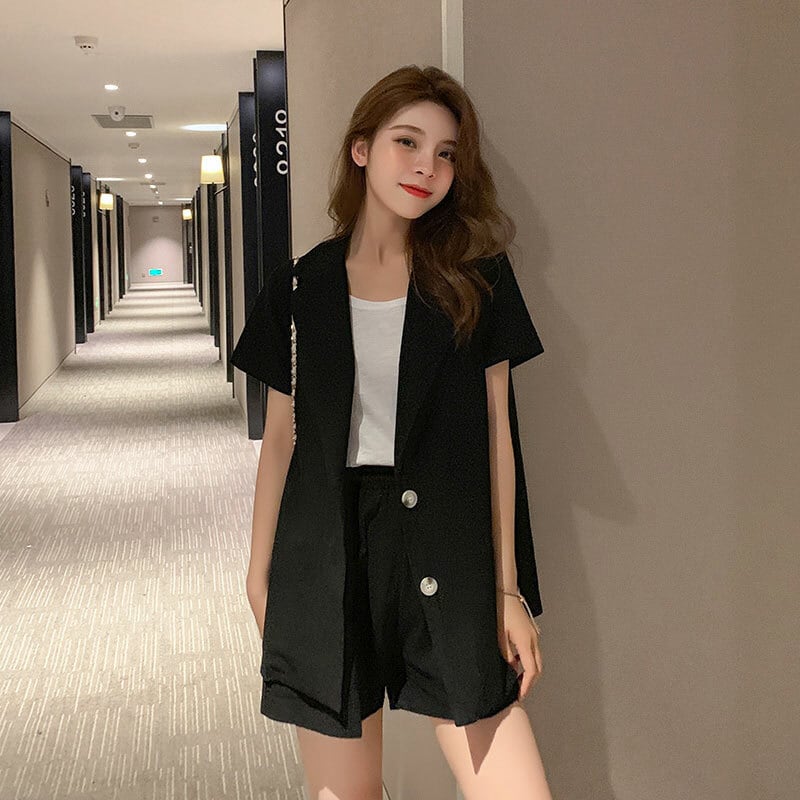 セットアップ 半袖 ジャケット ショートパンツ 無地 ブラック アプリコット カジュアル シンプル ハイウエスト 夏 リゾート fsk1068