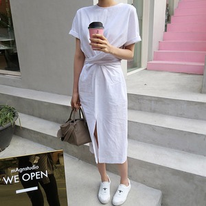 半袖ワンピース ミモレ丈 ホワイト 無地 クルーネック ウエストマーク スリット カジュアル シンプル 体型カバー ナチュラル 夏 fsk1075
