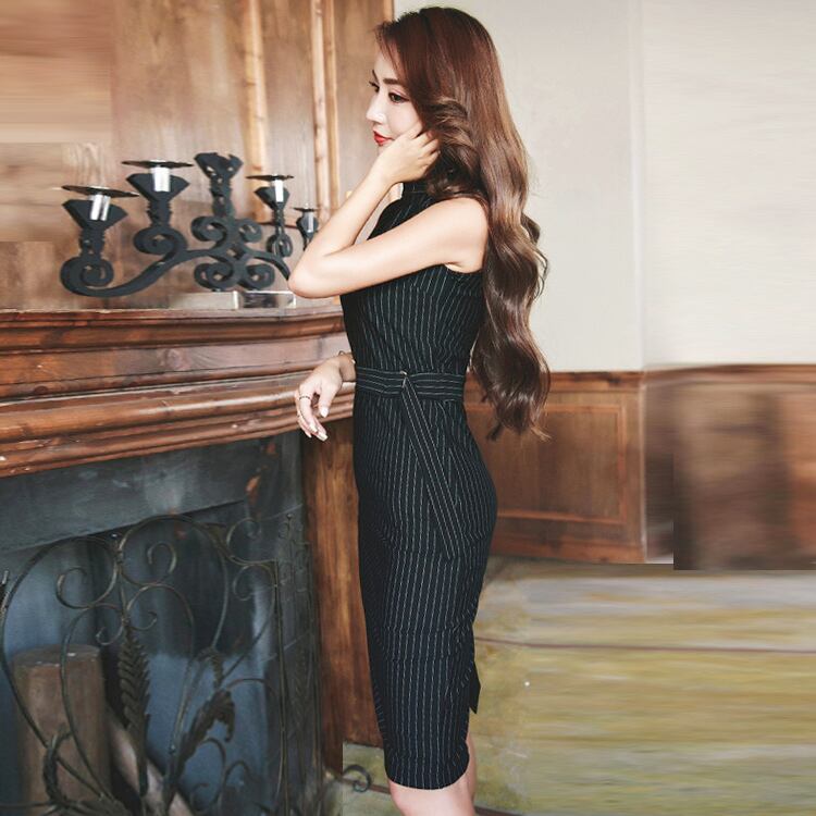 ノースリーブワンピース ひざ丈 ストライプ ブラック ウエストマーク クルーネック タイト エレガント スタイリッシュ 通勤 fsk1079
