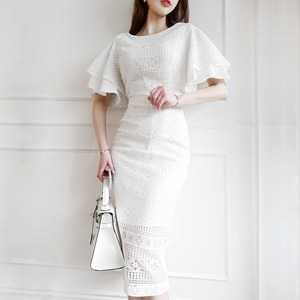 半袖ワンピース ひざ丈 ホワイト 無地 レース レトロ フレア袖 レイヤード ラウンドネック タイト きれいめ 夏 リゾート fsk1093