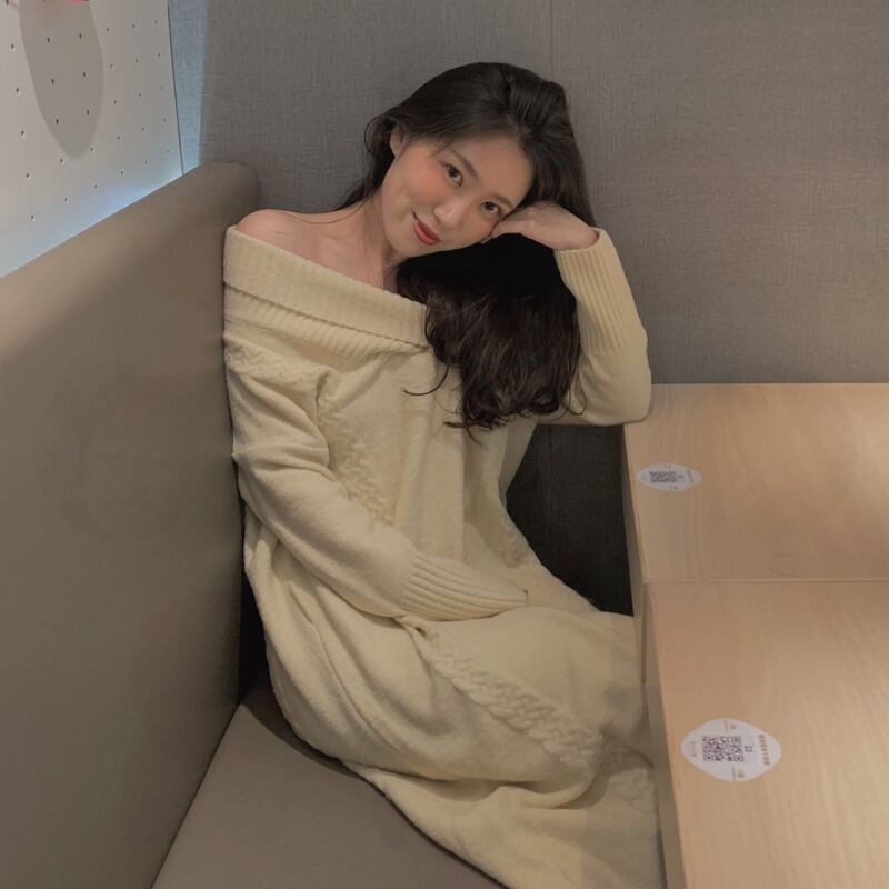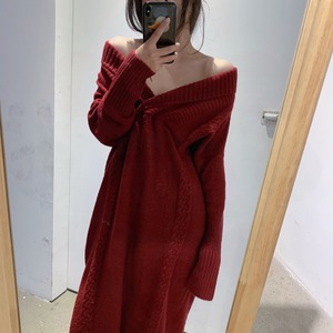 マキシワンピース ニットワンピース Vネック オフショルダー レッド ベージュ 無地 長袖 シンプル カジュアル セクシー 秋 fsk1300
