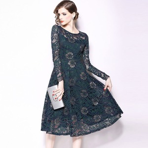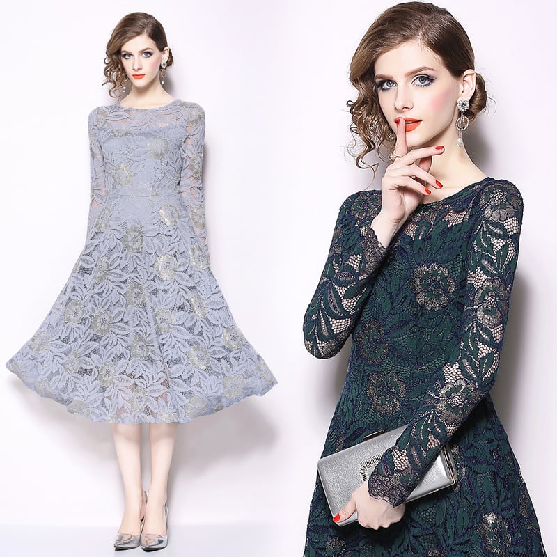 ひざ丈ワンピース 長袖 ラウンドネック レース フラワー シースルー Aライン グレー グリーン 結婚式 二次会 パーティー 秋