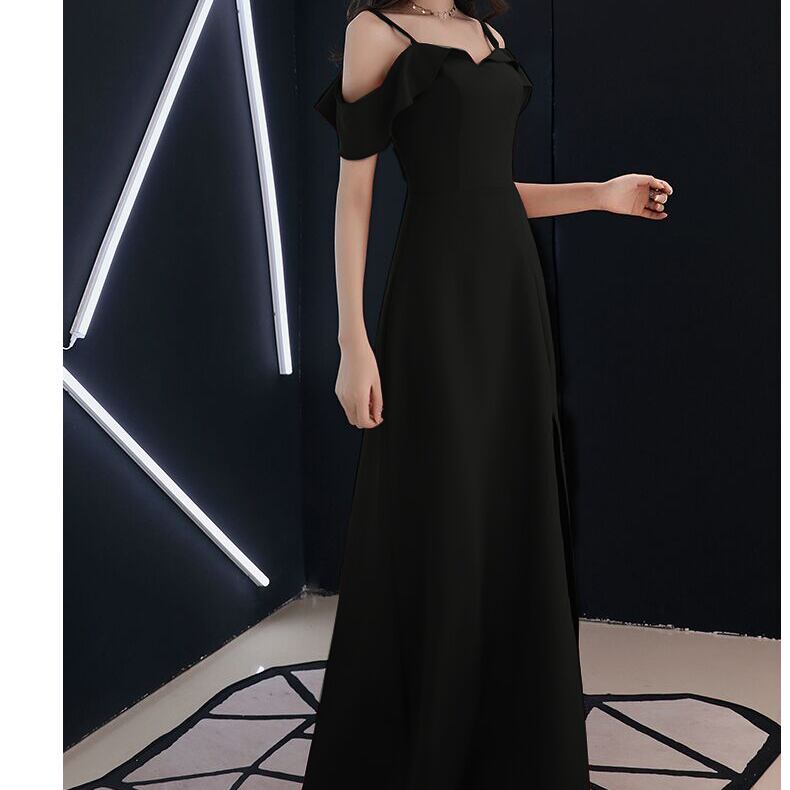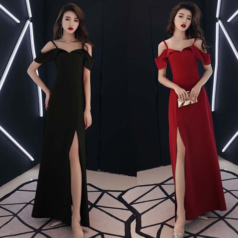 ドレス 結婚式 二次会 パーティー ロングドレス ワンピース レディースフォーマル キャミソール オフショルダー フリル スリット ブラック レッド 無地 セクシー fsk1321