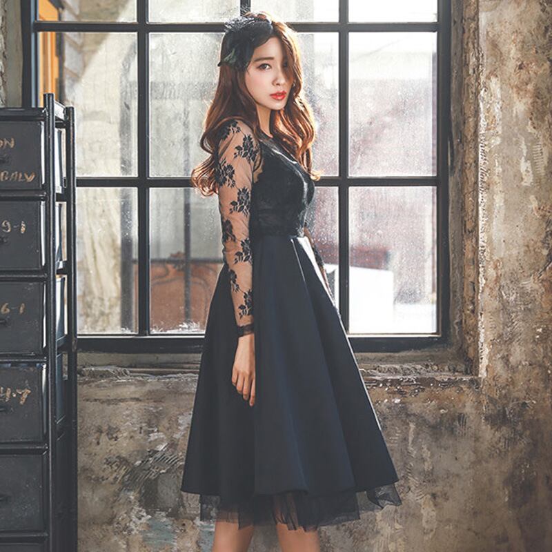 ドレス 結婚式 二次会 パーティー ひざ丈ワンピース 長袖 レース フラワー Aライン チュール シースルー ブラック 無地 レトロ fsk1332