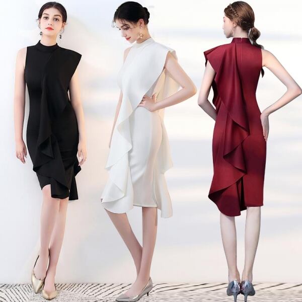 パーティドレス ドレス ひざ丈 ハイネック 無地 タイト 着痩せ フリル きれいめ エレガント 結婚式 二次会 お呼ばれ アシンメトリー
