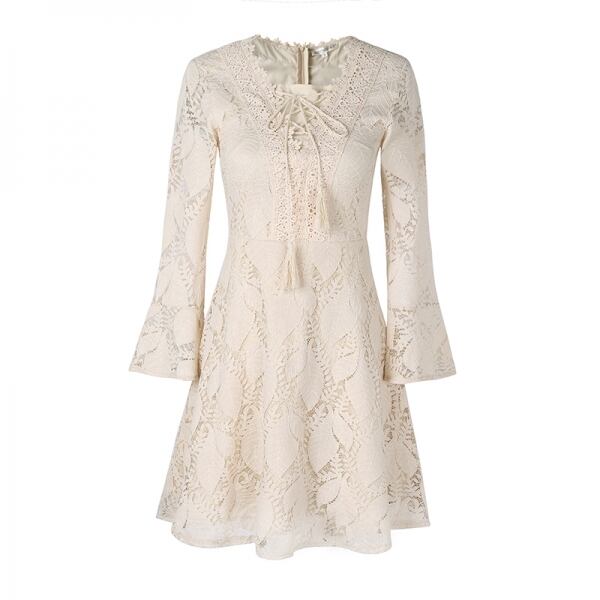 パーティドレス ドレス レース 総レース ショート丈 ミニ Vネック ベルスリーブ Aライン 着痩せ 袖あり 長袖 フェミニン 結婚式 二次会 お呼ばれ 発表会