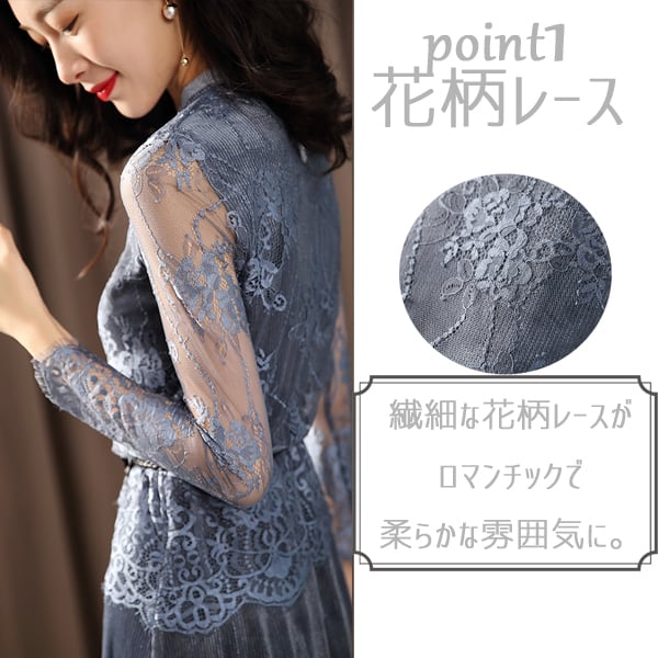 落ち着きのあるグレーが大人の女性にピッタリなツーピース風のドレスです。露出が少ないデザインでも、袖がシースルーなので重たくなりすぎません。繊細な花柄レースがロマンチックで柔らかな印象を演出してくれます。