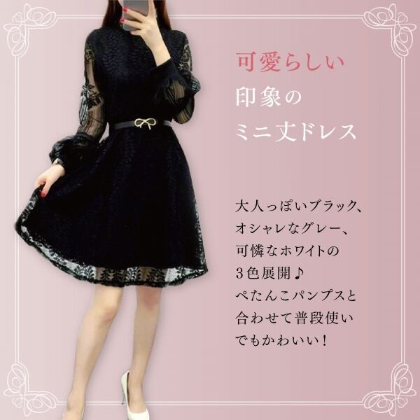 ワンピース パーティドレス レース ひざ丈 長袖 花 フラワー 刺繍 透け感 シースルー フェミニン エレガント 二次会 お呼ばれ ドレスワンピ