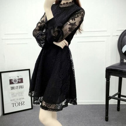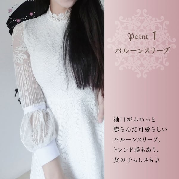 花柄のレースがフェミニンで大人可愛いワンピース。全体的にふわっとしたシルエットで、柔らかな印象を与えてくれます。露出少な目のデザインながら、袖は透け感があるので重たくなりすぎません。