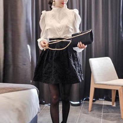 上品さが溢れるパフスリーブシャツ。モノトーンの落ち着いた中に刺繍柄がよく映えた1枚。ちょっとした食事会などおしゃれな空間にばっちり。