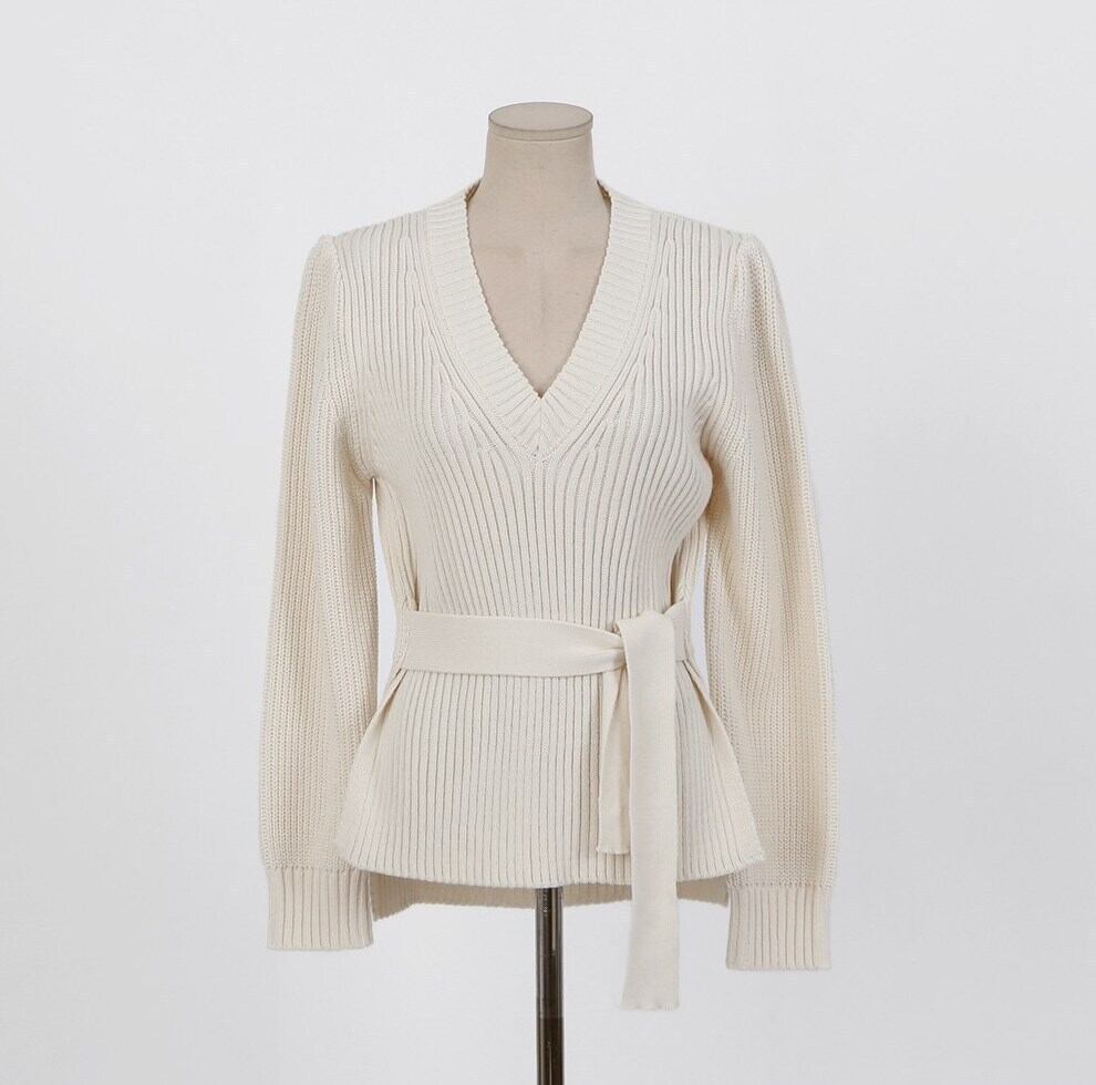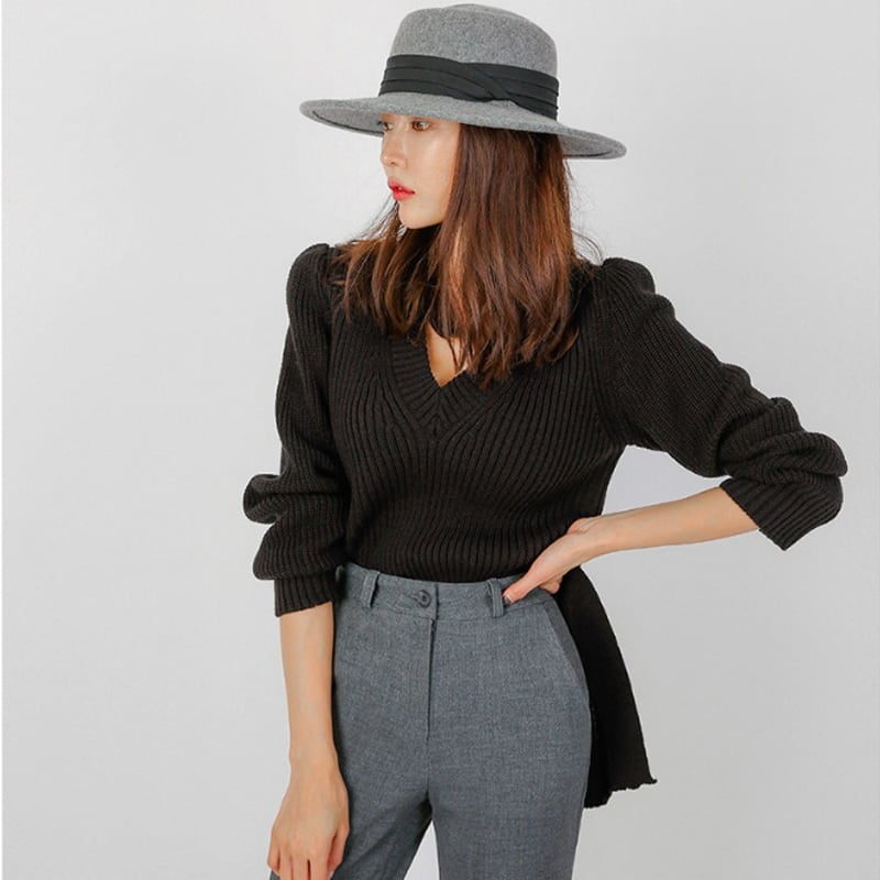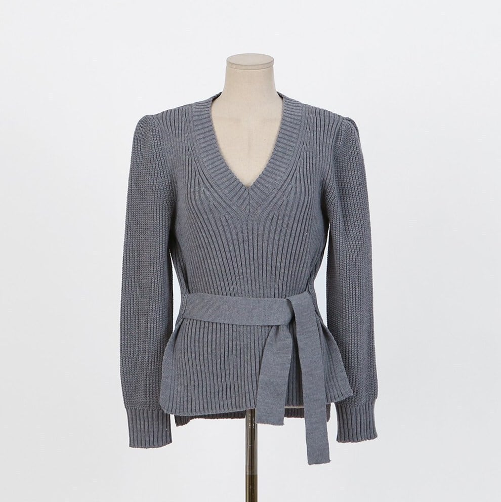 リブニットにパフショルダーとセクシーなVネックで女性らしいラインのセーターです。ウエストのベルトを締めると着やせ効果あり、ベルトなしでもパンツを合わせてかっこいいスタイリングも!