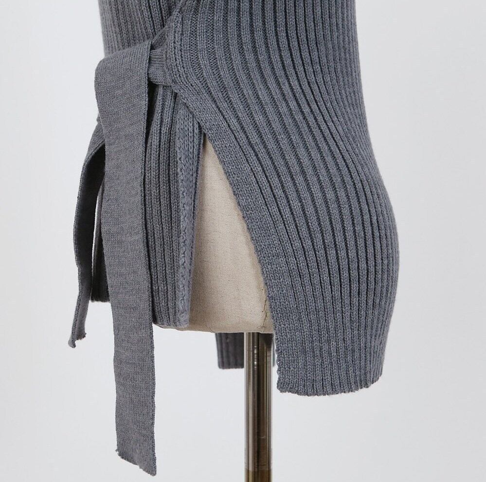ニット セーター パフショルダー ステップドヘム スリット ウエストベルト セクシー エレガント Vネック すっきり デートコーデ デート 秋冬 着やせ効果 マニッシュ フェミニン リブニット スリット