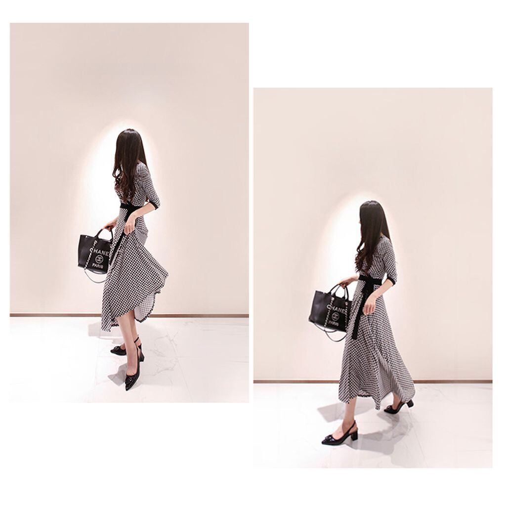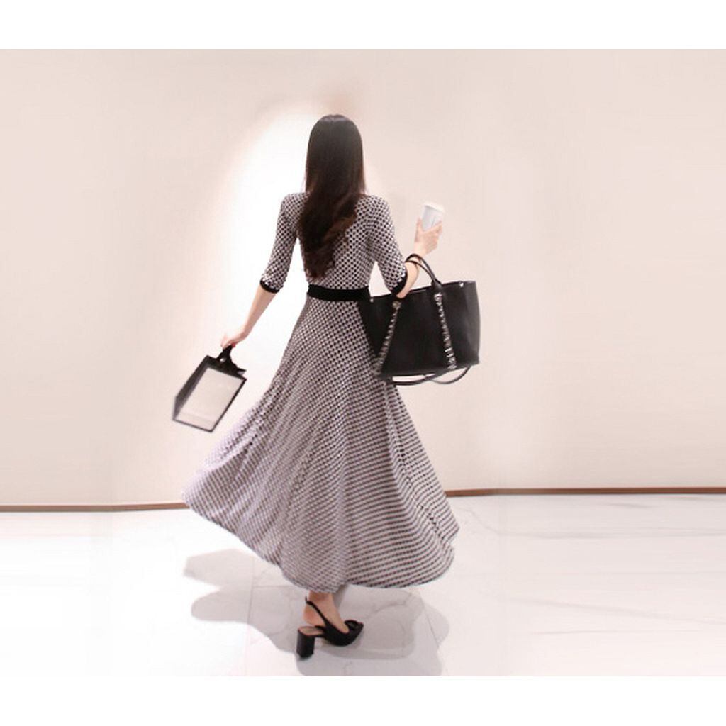 ワンピース ラップドレス ラップワンピース ロング丈 ウエストマーク ハイウエスト フレア リボン モノトーン セクシー デイリー デート 20代 30代 五分袖 すっきり Vネック