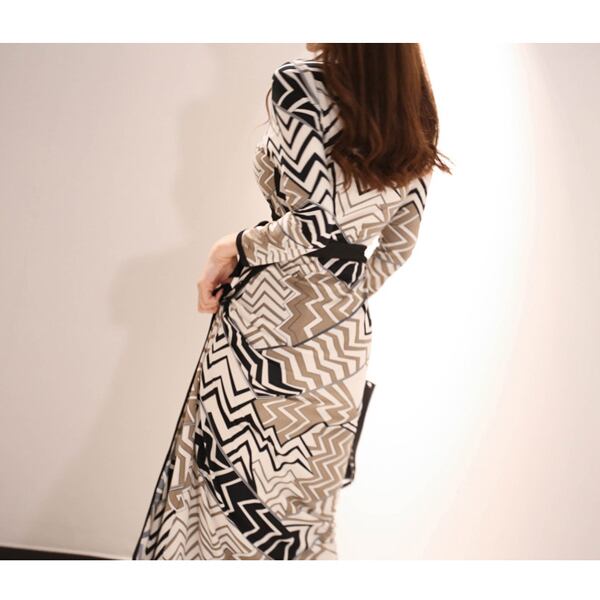 ラップドレス ワンピース 幾何学模様 ウエストマーク サイドリボン ロング丈 パーティー カジュアル エレガント セクシー Vネック 五分袖