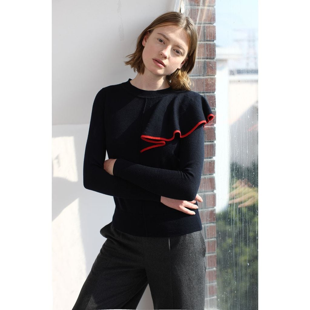 胸元のラッフルフリルが目を引くデザインのニットです。デザイン性が強いため、シンプルなボトムとの相性がいいです。