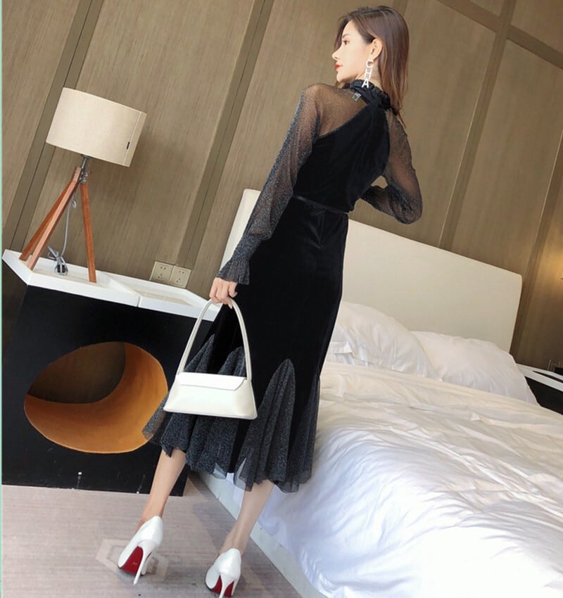 ワンピース ロングドレス パーティー シースルー グリッター ラメ 異素材 透け感 裾切替 ベルベット ワンピ エレガント セクシー ハイネック