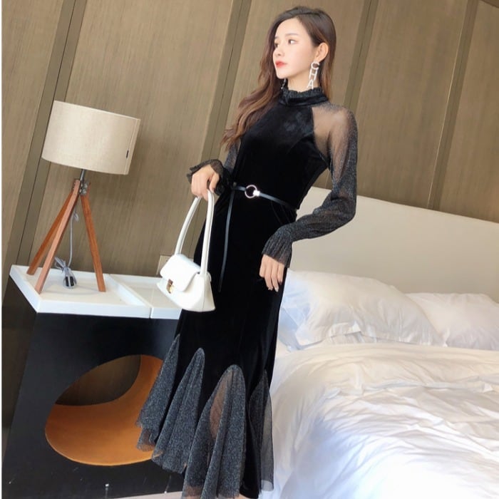 ベルベットとシースルーの異素材切り替えが珍しいワンピースです。1枚で様になるので、パーティなどで活躍すること間違いなし。