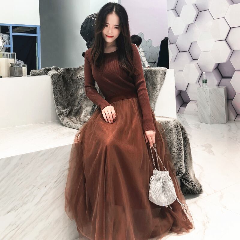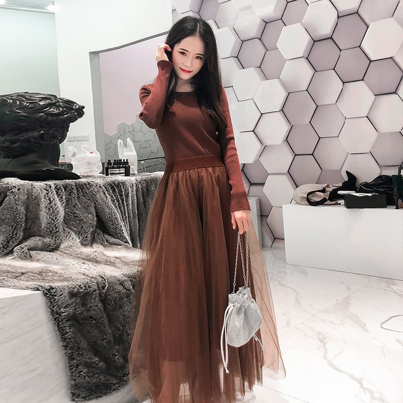 ワンピース オールインワン ニット チュール 切替 フレア Aライン エレガント きれいめ 上品 シースルー 女子会 デート カジュアル スリム セクシー 異素材 ラウンドネック 大きいサイズ fsk1477