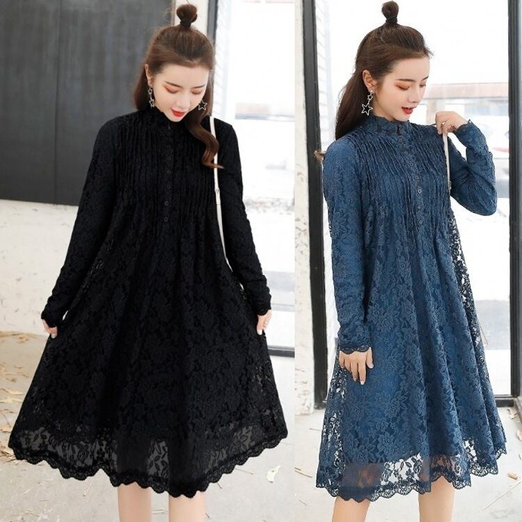 ワンピース レースワンピース Aライン レース プリーツ ガーリー 透け感 スタンドカラー ドレス パーティ フェミニン 膝丈 総レース