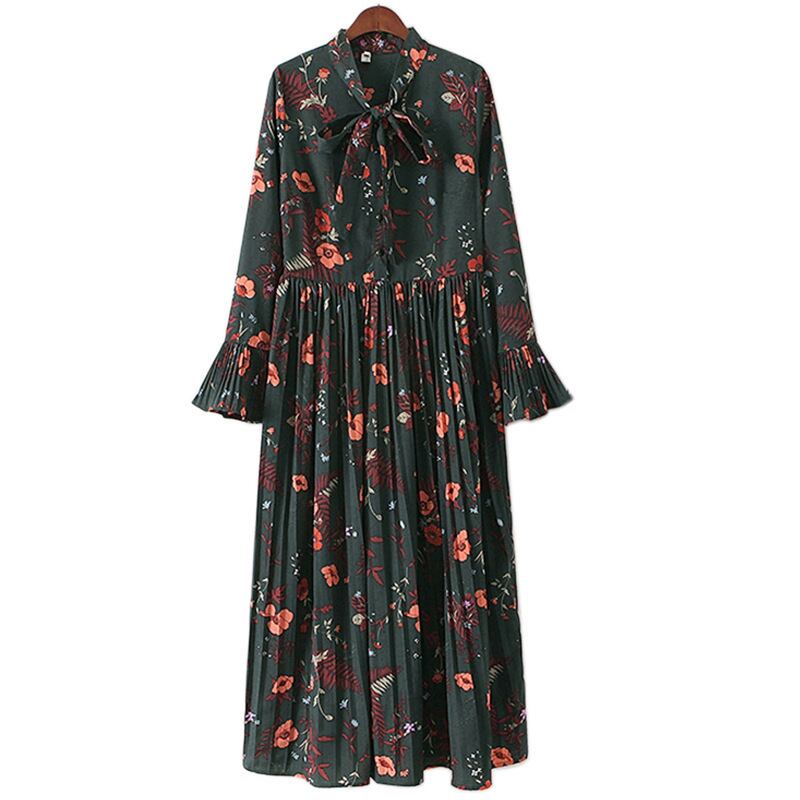 小花柄の可愛らしいデザインのワンピースです。袖のフレアプリーツがアクセントになっています。1枚でおしゃれに見える万能ワンピです。