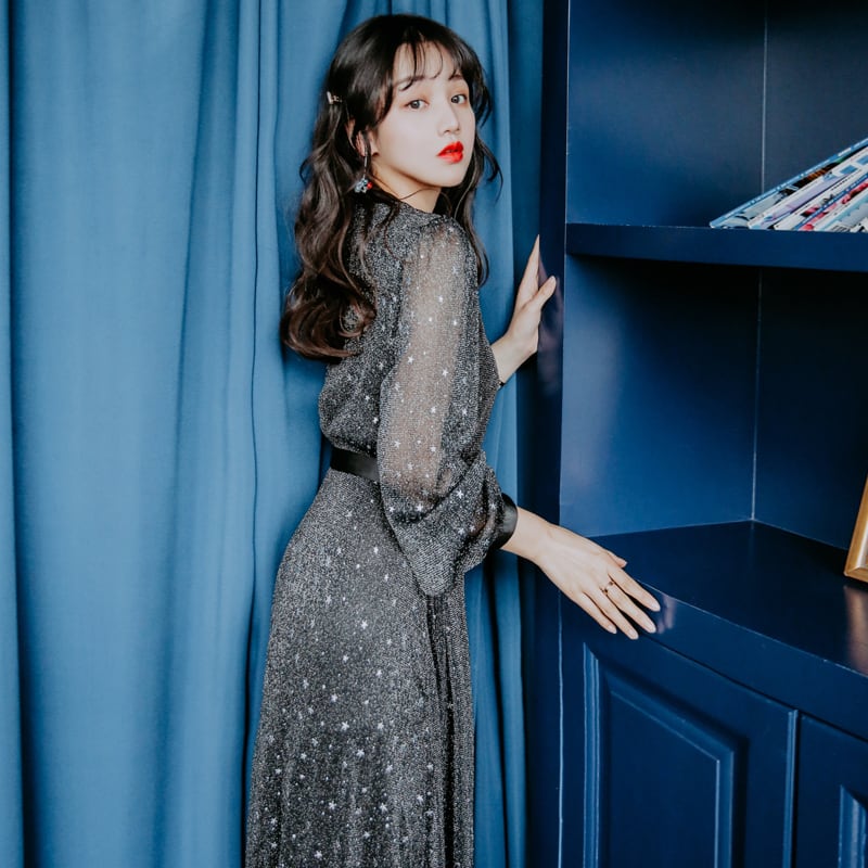 グリッターが目を引く主役級のワンピースです。光の加減で見え方が変わって飽きないデザインです。