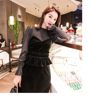 セットアップ ペプラムトップス ラウンドネック タイトスカート グリッター シースルー パーティ 二次会 シンプル ミモレ丈 ガーリー フェミニン ベロア バックスリット 10代 20代 30代