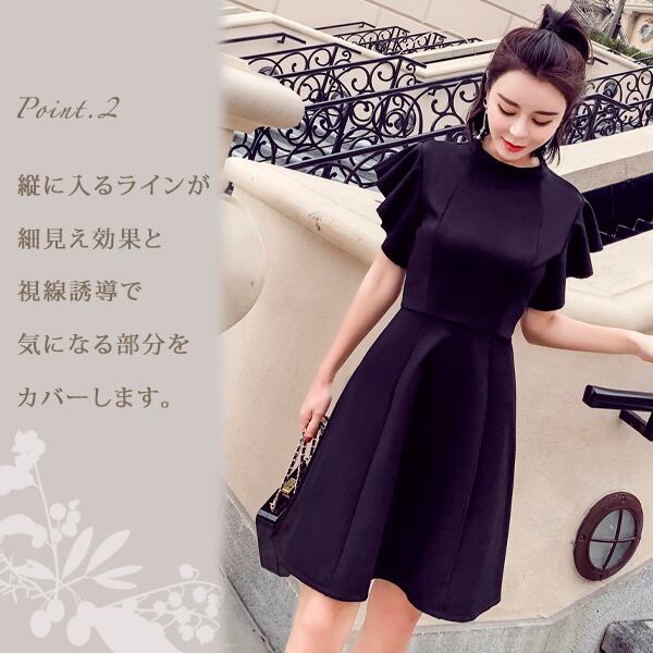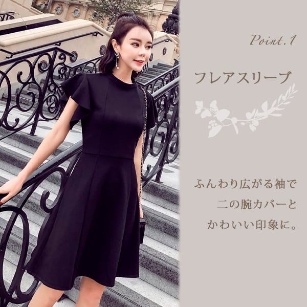 シンプルなデザインながらスタイルアップが期待できるブラックのワンピースです。ふんわり広がるフレアスリーブは肩から二の腕の気になる部分をカバーしてくれます。ハイウエストのスカートには縦のラインが入っており、細見え効果も期待できます。