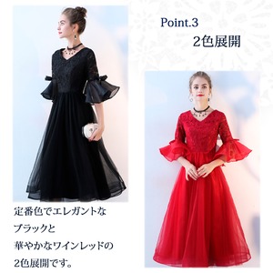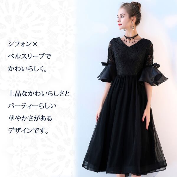 ドレス 結婚式 二次会 パーティー ひざ下丈 レース Vネック Xライン 五分袖 ベルスリーブ ガーリー フェミニン 春夏 お呼ばれドレスワンピ 透け感 大きいサイズ fk1551