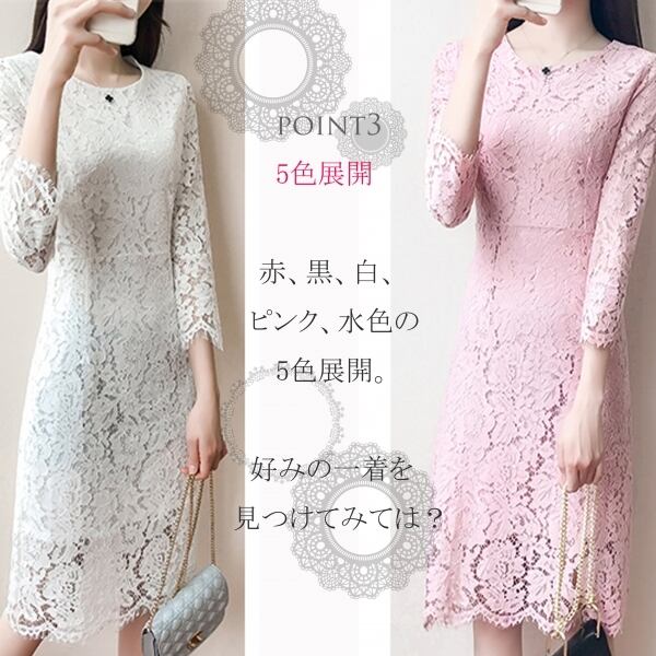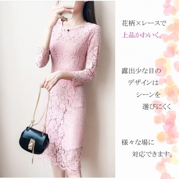 花柄の総レースが華やかな印象を演出するワンピースドレスです。7分袖なので手元を華奢に見せてくれる効果も期待できます。シンプルなデザインなので、アクセサリーや小物次第で様々なシチュエーションでお使いいただけます。