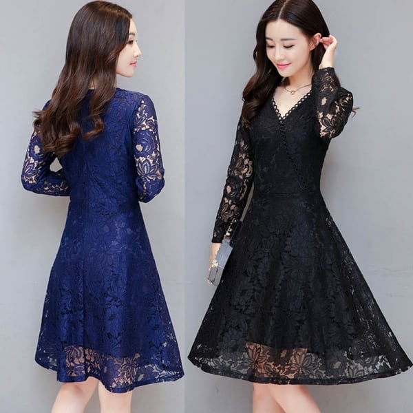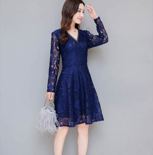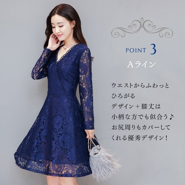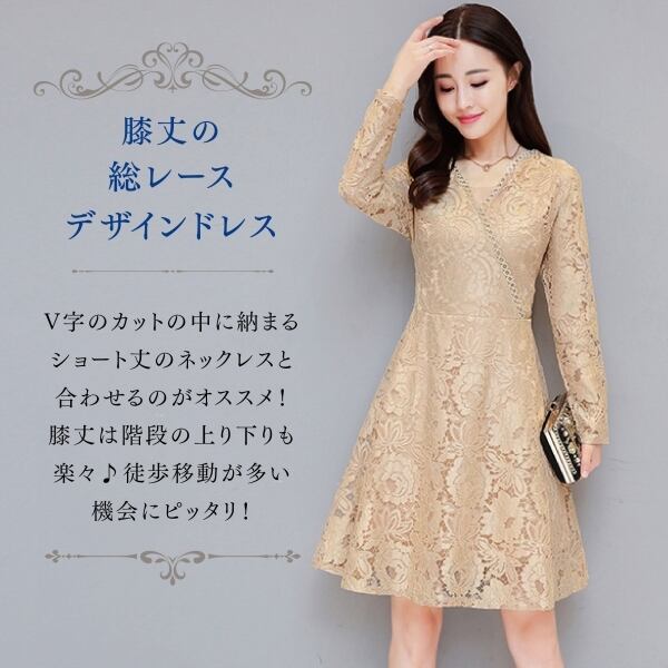 ドレス 結婚式 二次会 パーティー レース ひざ丈 Vネック 長袖 半袖 花刺繍 透け感 シースルー フェミニン エレガント 春夏 大きいサイズ