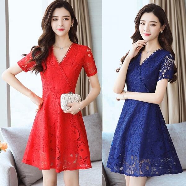 ドレス 結婚式 二次会 パーティー レース ひざ丈 Vネック 長袖 半袖 花刺繍 透け感 シースルー フェミニン エレガント 春夏 大きいサイズ fk1208
