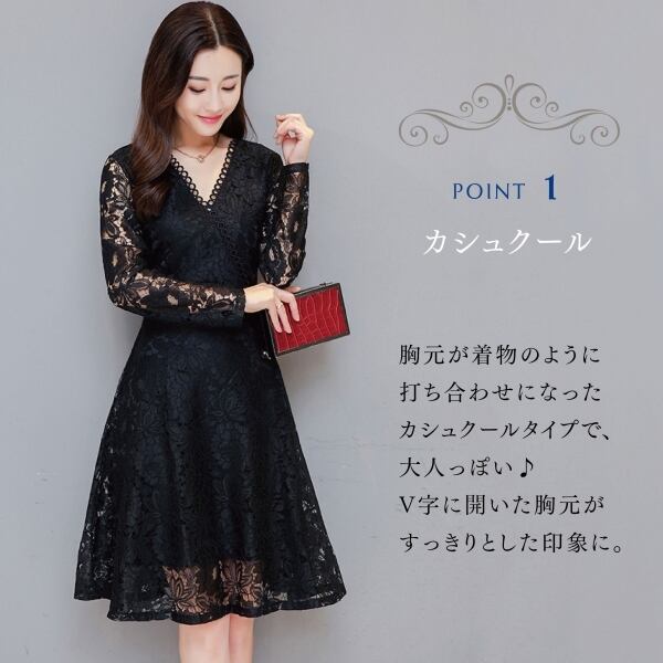 カシュクールタイプのVネックがエレガントな総レースワンピースです。