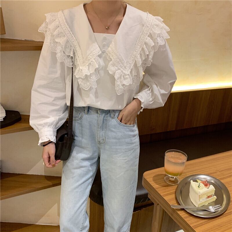 ブラウス シャツ フリル レース ビッグカラー 学生風 レース ボリューム袖 フリル袖 ゆったり カジュアル デート オフィス オーバーサイズ 10代 20代 春夏