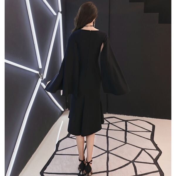 エレガントかつ大胆なデザインが目を引くパーティードレスです。ケープのような袖と裾のカットが作り出すきれいなシルエットは大人の女性にぴったりです。胸元はVネックなのですっきりとした印象を与えてくれます。